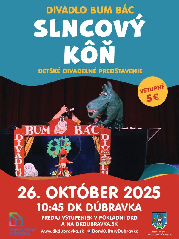 Hop a je tu klasická bábková rozprávka. SLNCOVÝ KÔŇ je gašparkové divadielko, tak trochu muzikál s chytľavými veselými melódiami spievanými naživo s gitarou. Dvaja účinkujúci – BUM (Eliška Gregoričková) a BÁC (Marián Gregorička) hrajú, spievajú a rozprávajú deťom príbeh o napínavom putovaní rozprávkového veštca a Gašparka za strateným zázračným koňom.