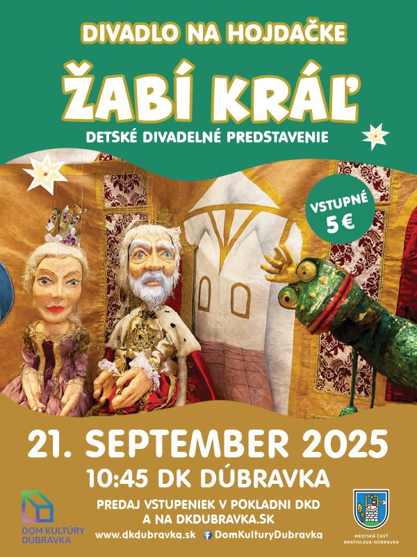 Známa rozprávka zo zbierky bratov Grimmovcov sa stala námetom pre naše bábkové predstavenie, ktoré deti nenechá len tak sedieť na stoličkách. V spolupráci s publikom sa bude čarovať, spievať či tancovať, odvážne princezné z hľadiska dostanú šancu bozkom vyslobodiť zakliateho princa. Na koniec bude veselá svadba a princ sa kráľom stane.